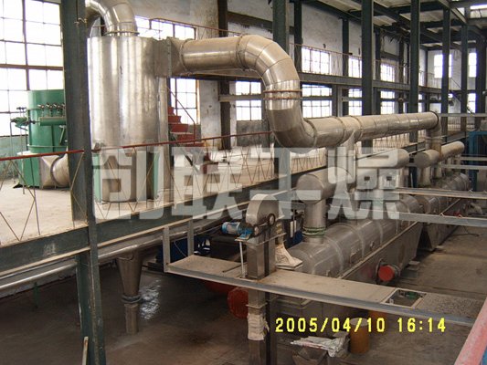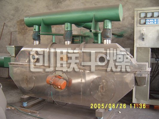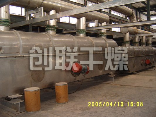 物料自进料进口进入机内,在振动力作用下,物料沿水平面流化床抛掷,向前连续运动,热风向上穿过流化床同湿物料换热后,湿空气经旋风分离器除尘后由排风1:3排出.干燥物料由排料进口排出。