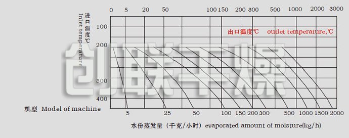 注:水份蒸发量与物料的特性及热进风、出口温度相关。当出口温度为90oC,其水份蒸发曲线见上图(供选型参考),随着产品不断更新,有关参数变更,恕不预先通知。