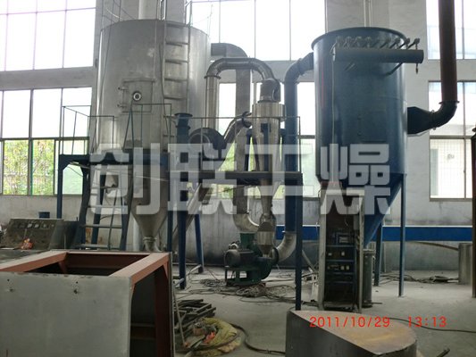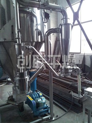 该机采用全封闭形式,所有部件均采用不锈钢制造,配有三级净化装置,过滤后的空气达十万级要求。筒体与顶部装有冷壁装置,使壁温<80℃,干燥塔内装有气刷扫塔装置。经该机干燥后的中药浸膏粉,不会出现焦化变质现象,大大增加了收粉率(95%以上),而且不会产生混药现象和粘壁现象。