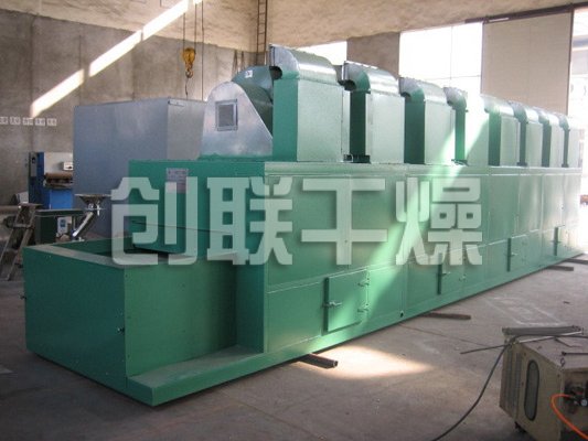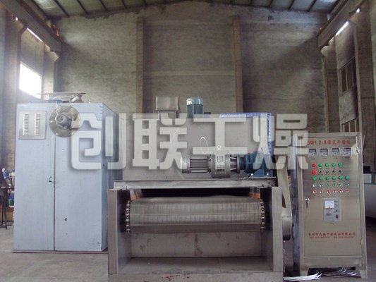 物料由加料器均匀地铺在网带上,网带一般采用12-60目不锈钢丝网,由传动装置拖动在干燥机内移动。干燥机由若干单元组成,每一单元热风独立循环,部分尾气由专门排湿风机排出,废气由调节阀控制,热气由下往上或由上往下穿过铺满物料的网带完成热量与质量传递的进程,带走物料水份。网带缓慢移动,运行速度可根据物料温度自由调节,干燥后的成品连续落入收料器中。上下循环单元根据用户需要可灵活配备,单元数量亦可根据需要选取。