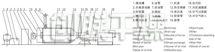 燃料通过燃烧器燃烧,产生高温燃气。并借助具有强化换热措施的热风炉将高温燃气的热量传导给被加热的空气,高温燃气经热量散发后温度降低至250℃后排到大气中。需加热的空气通过选配的鼓风机强送入热风炉,吸热后温度升至额定值从热风出口处送出,当热风温度达到额定温度上限时,燃烧器会自动停止燃烧或自动转为小火焰燃烧,当热风温度降低到额定下限温度时,燃烧器又会重新点燃运行或转为大火燃烧,升温的速度可以调节进风阀的开度来实现。
