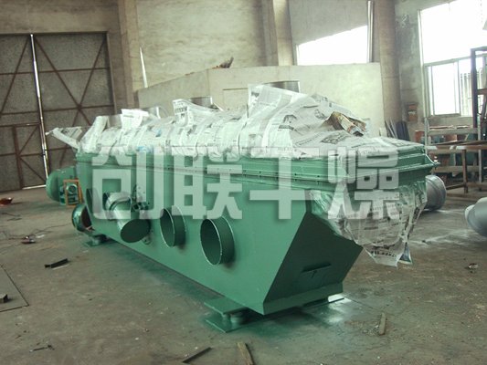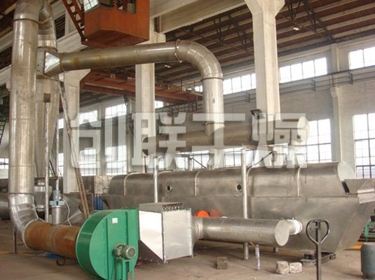 物料自进料进口进入机内,在振动力作用下,物料沿水平面流化床抛掷,向前连续运动,热风向上穿过流化床同湿物料换热后,湿空气经旋风分离器除尘后由排风1:3排出.干燥物料由排料进口排出。