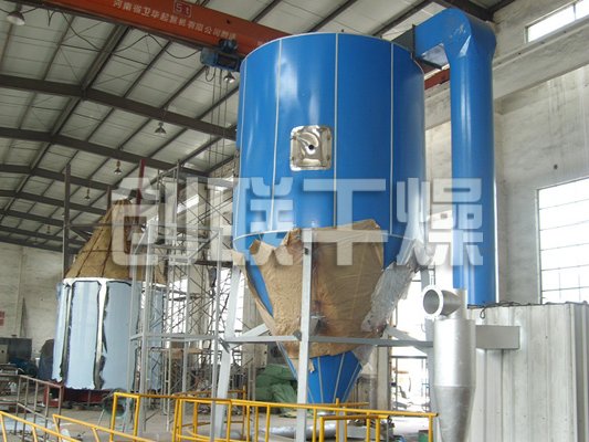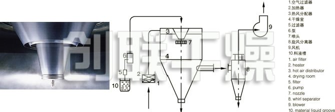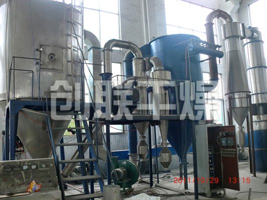 空气经过滤和加热,进入干燥器顶部空气分配器,热空气呈螺旋状均匀地进入干燥室。料液经塔体顶部的高速离心雾化器,(旋转)喷雾成极细微的雾状液珠,与热空气并流接触在极短的时间内可干燥为成品。成品连续地由干燥塔底部和旋风分离器中输出,废气由风机排空。