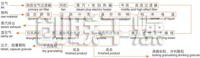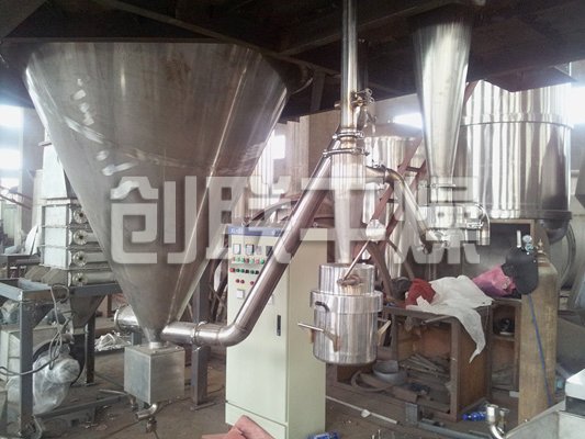 该机采用全封闭形式,所有部件均采用不锈钢制造,配有三级净化装置,过滤后的空气达十万级要求。筒体与顶部装有冷壁装置,使壁温<80℃,干燥塔内装有气刷扫塔装置。经该机干燥后的中药浸膏粉,不会出现焦化变质现象,大大增加了收粉率(95%以上),而且不会产生混药现象和粘壁现象。