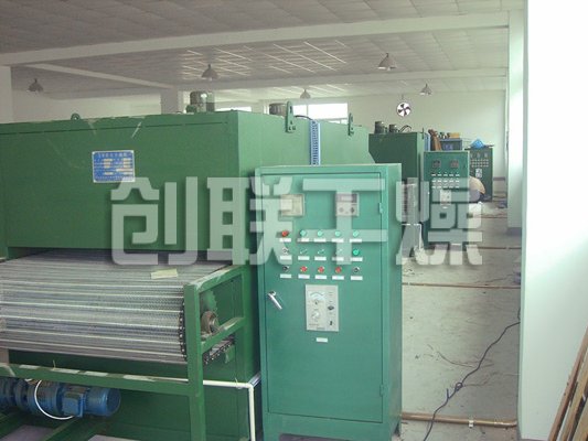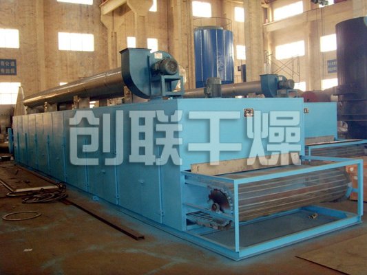 物料由加料器均匀地铺在网带上,网带一般采用12-60目不锈钢丝网,由传动装置拖动在干燥机内移动。干燥机由若干单元组成,每一单元热风独立循环,部分尾气由专门排湿风机排出,废气由调节阀控制,热气由下往上或由上往下穿过铺满物料的网带完成热量与质量传递的进程,带走物料水份。网带缓慢移动,运行速度可根据物料温度自由调节,干燥后的成品连续落入收料器中。上下循环单元根据用户需要可灵活配备,单元数量亦可根据需要选取。