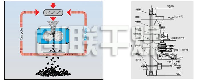 对辊式挤压造粒的工艺原理是:干物料在压力作用下团聚成致密坚硬的大块(饼料),称为挤压过程;饼料再被破碎筛分后成为颗粒料称为造粒过程。挤压的作用一是将颗粒间的空气挤掉,另外是使颗粒间距达到足够近,以产生如范德华力、吸附力、晶桥及内嵌连接等吸引力。挤压造粒的颗粒主要是靠分子之间的作用力形成的颗粒强度。