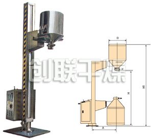 TJG 系列固定提升加料机由两部分组成,即提升机及底座。提升机由机架、液压提升系统及料门翻转机构组成。工作时,先将提升机的料门与料桶扣合,启动提升操作杆,料门与料桶一起上升,启动翻转操作杆,料桶即可番转180度,呈底桶向上姿态并移动到所需位置,利用料门上出料蝶阀,可很容易将物料加入所需的工艺设备中。